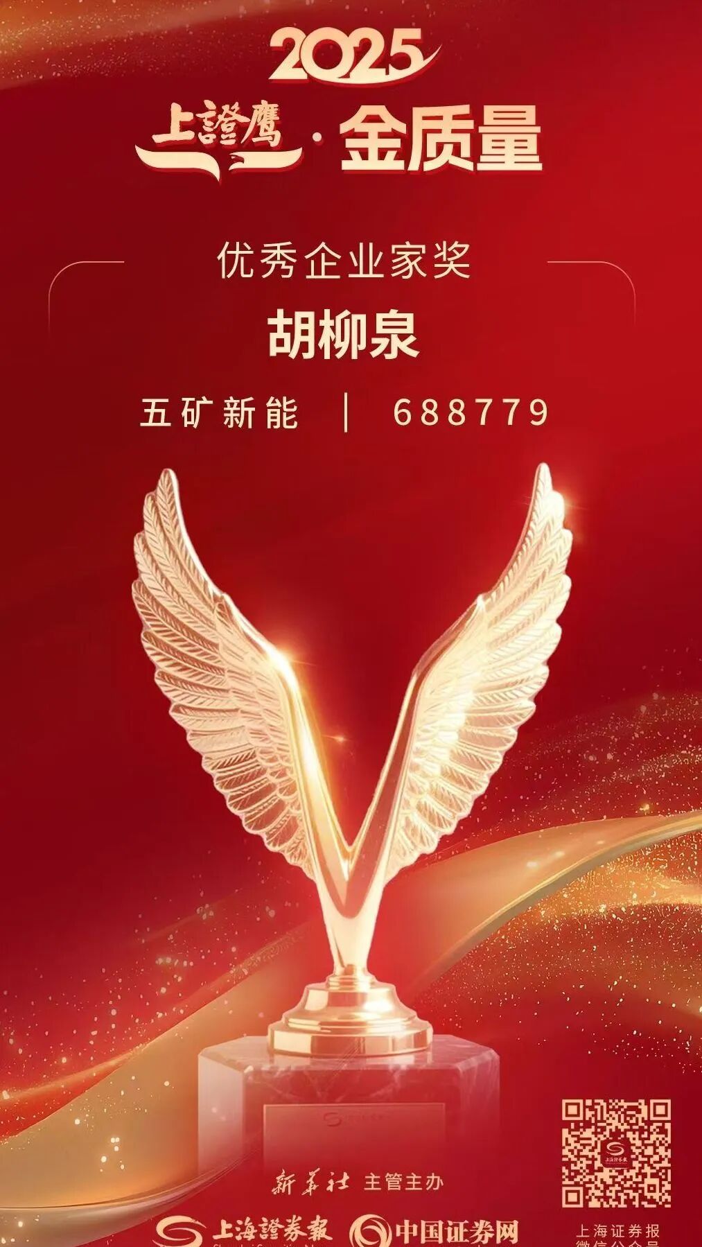 近日,备受资本市场瞩目的2025上证(巢湖)上市公司高质量发展大会在安徽合肥举办。会议以“资本赋能科创,产业引领未来”为主题,汇聚来自政府监管部门、上市公司、金融机构等领域的逾千名重磅嘉宾,共同探讨以资本市场力量激活创新动能、以制度创新护航企业行稳致远的发展路径。会议同时揭幕2025“上证鹰·金质量”获奖名单,凭借在公司治理、规范运作等方面的卓越表现,五矿新能荣获“上证鹰·金质量”公司治理奖,公司党委书记、董事长胡柳泉荣获优秀企业家奖。